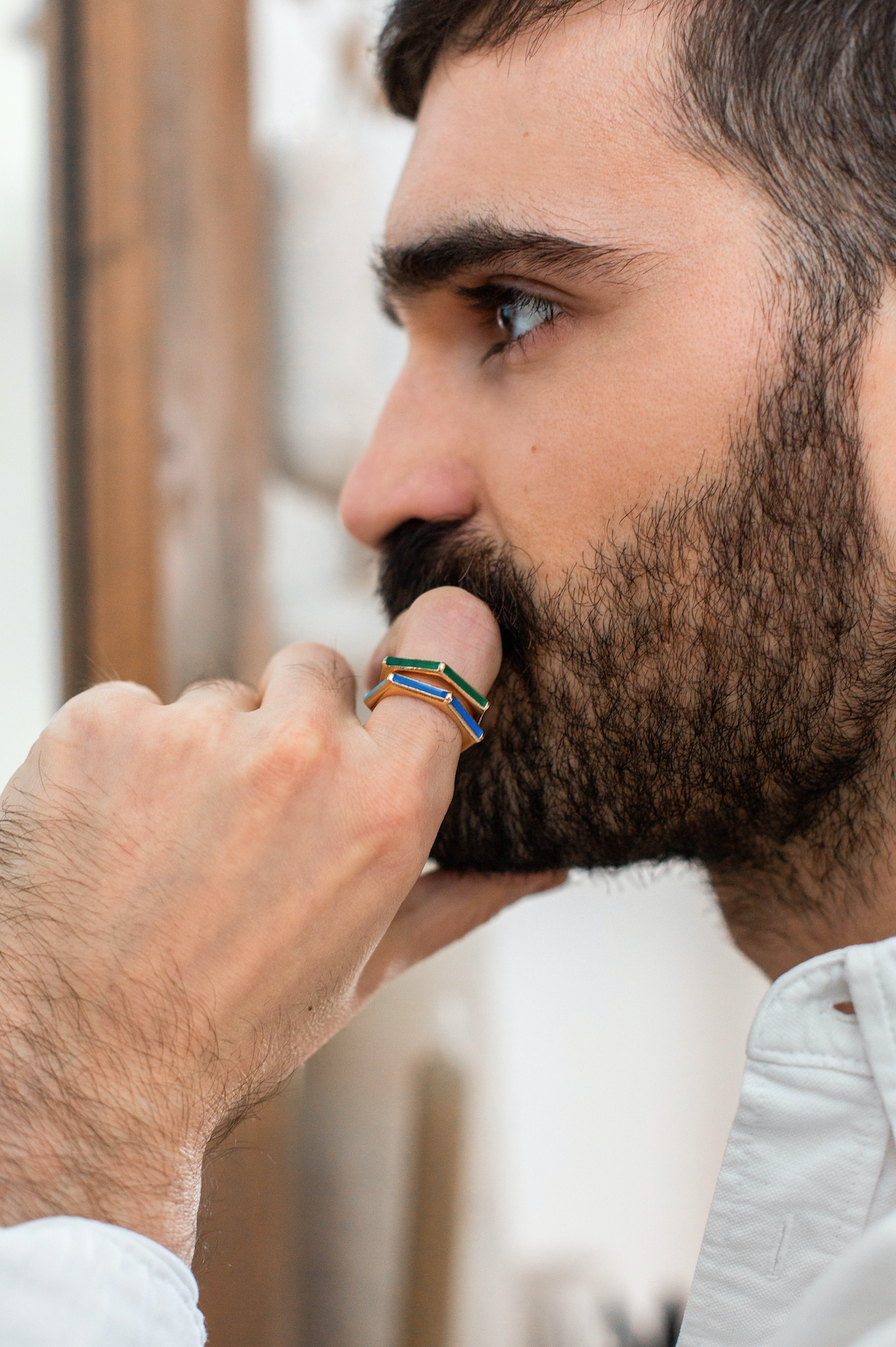 Portrait du modèle Romain, portant deux bagues à son doigt, une verte et une bleu en or de la marque Ghizo Paris