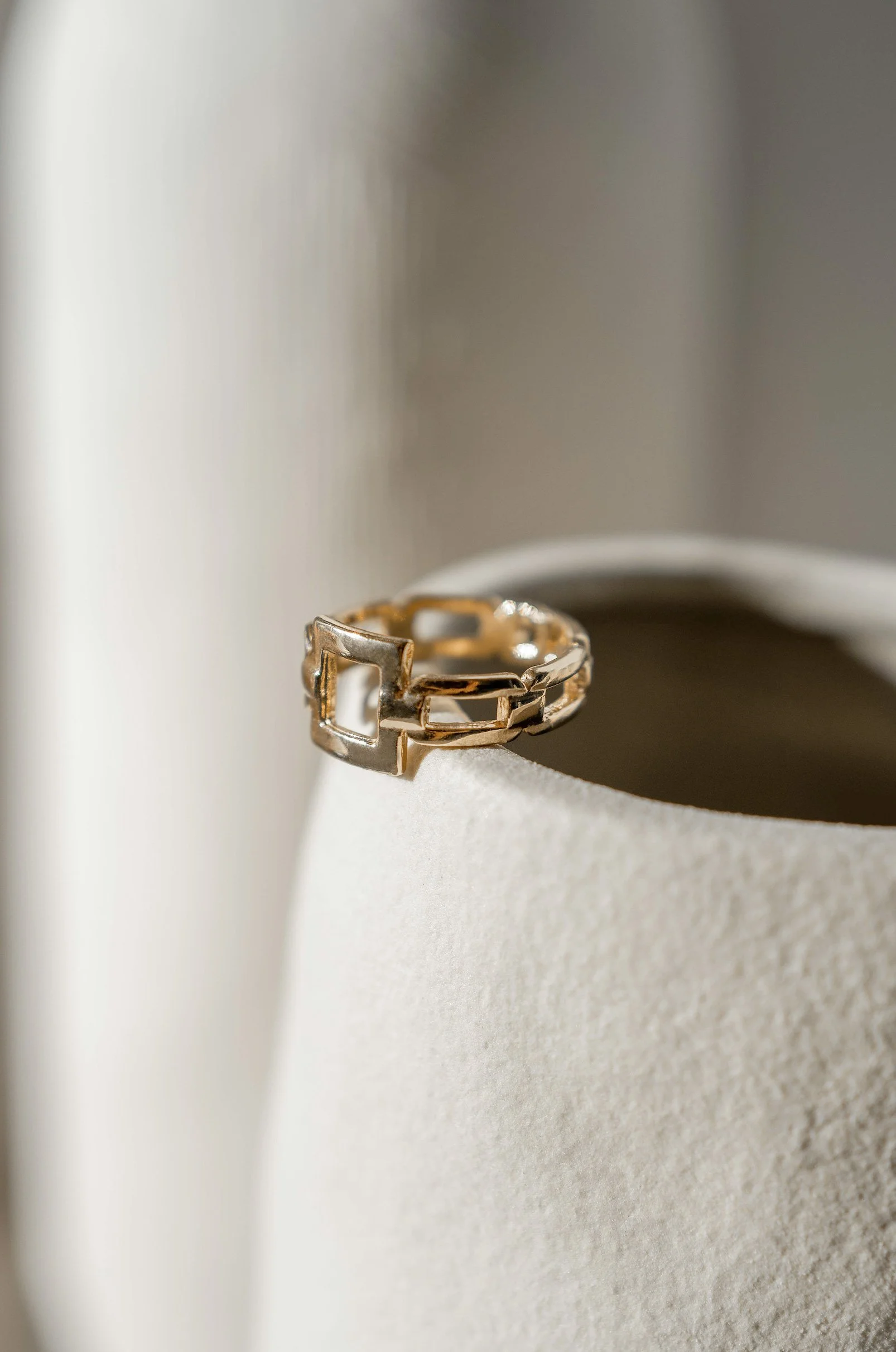 Une bague en or de la marque Ghizo Paris, brillante, posée sur le rebord d'un vase
