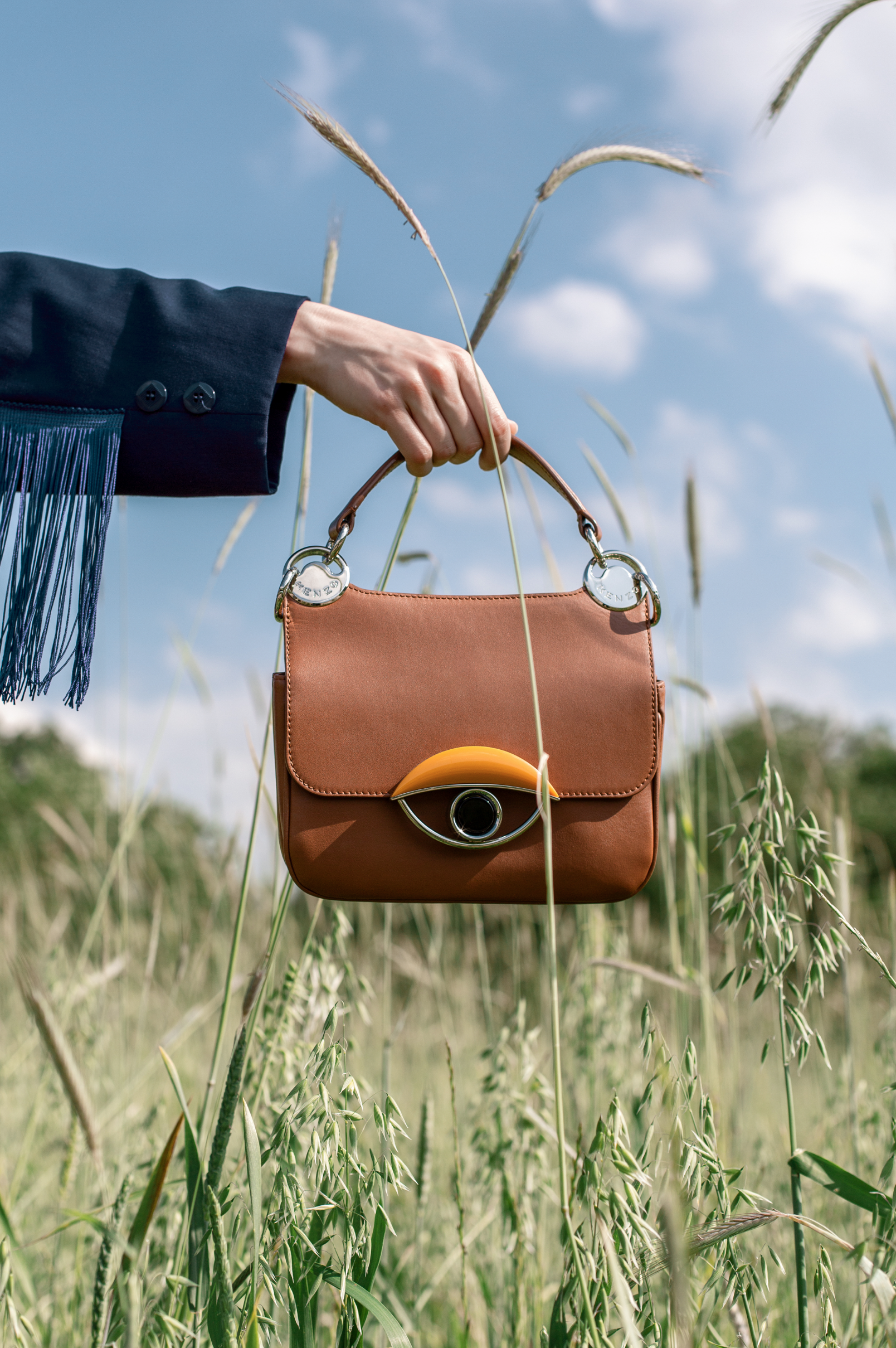 Sac Kenzo vintage, porté par une main au dessus d'un champ et devant un grand ciel bleu