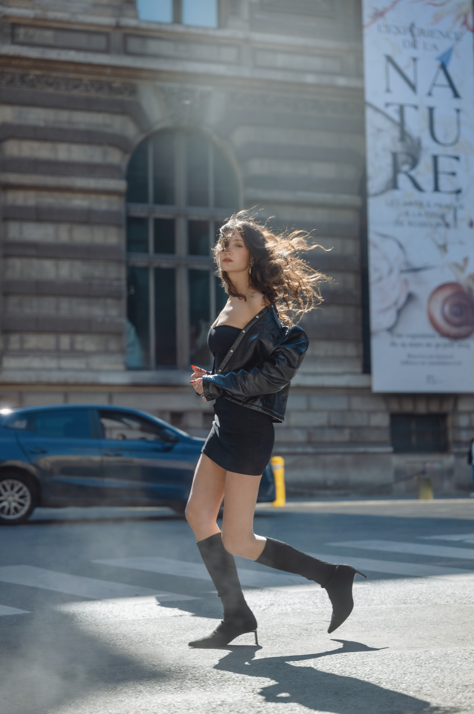 La modèle Cynthia court dans Paris cheveux au vent, traversant un passage piéton