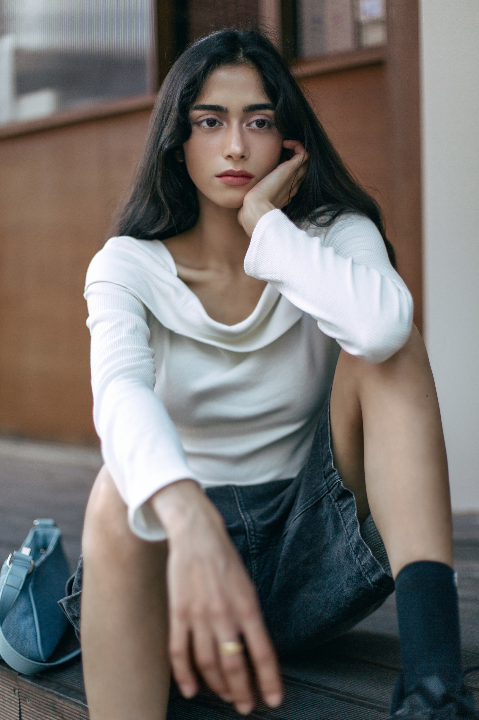 La modèle Ana assise sur les marches d'un café à Séoul, pensive la tête posée sur le rebord de sa main
