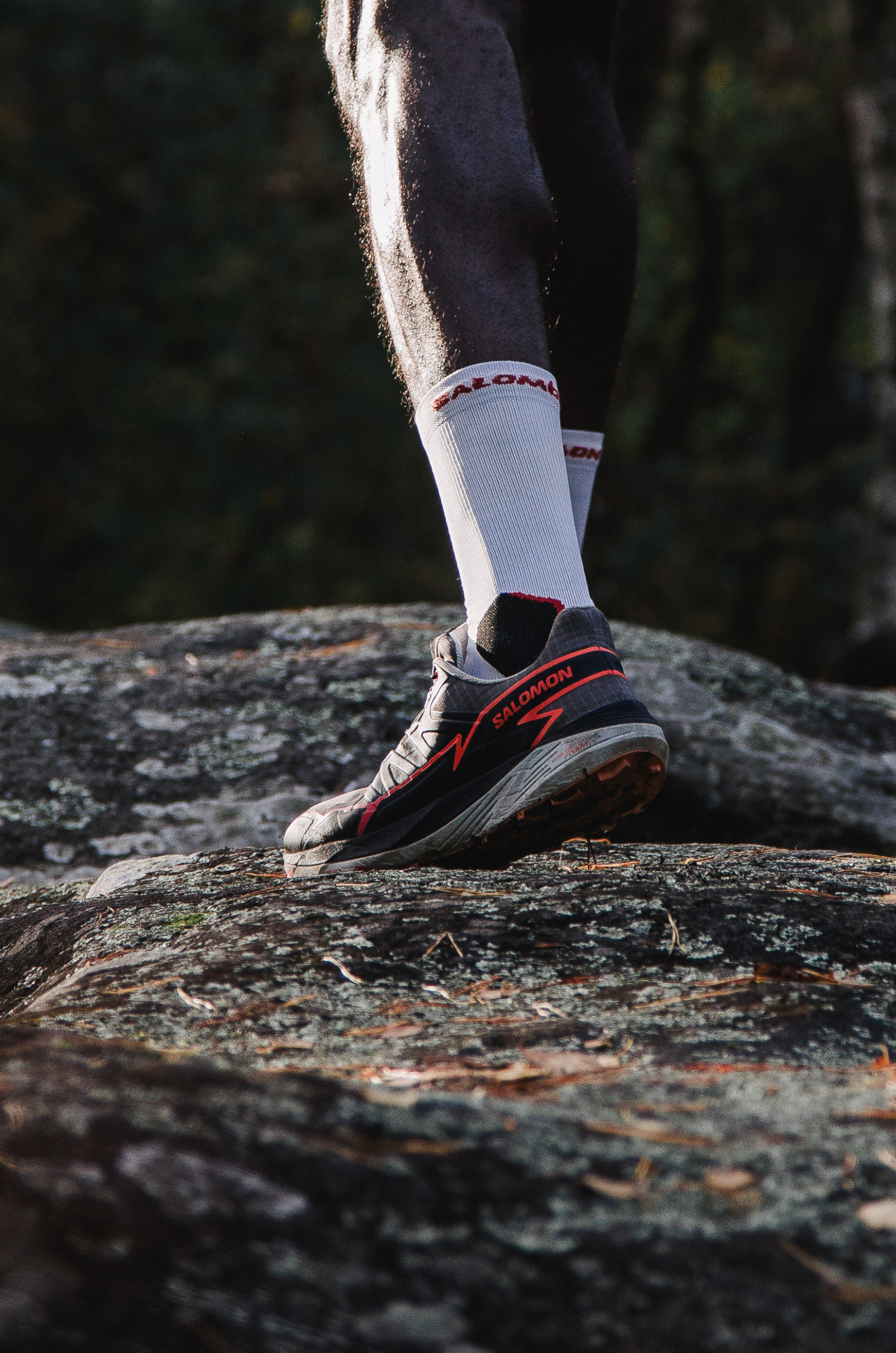 Focus sur les baskets de la marque Salomon, portées par l'un des ambassadeurs de la marque, lors d'une sortie à Fontainebleau