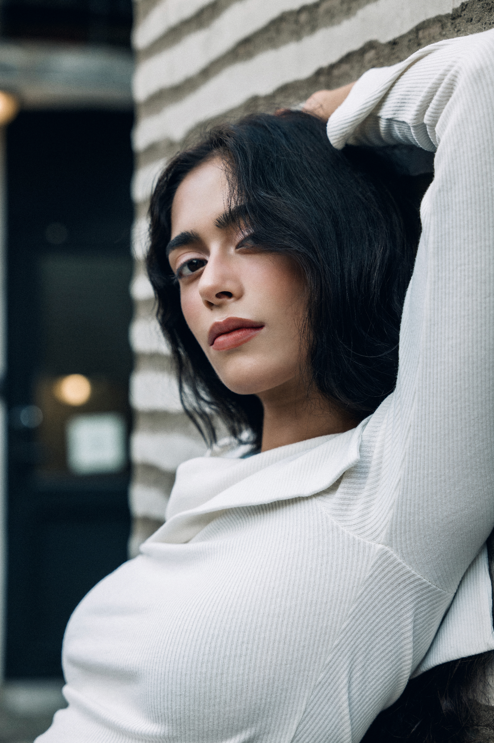 Portrait de la modèle Ana, reposant sur le mur d'un immeuble à Seoul et regardant l'objectif