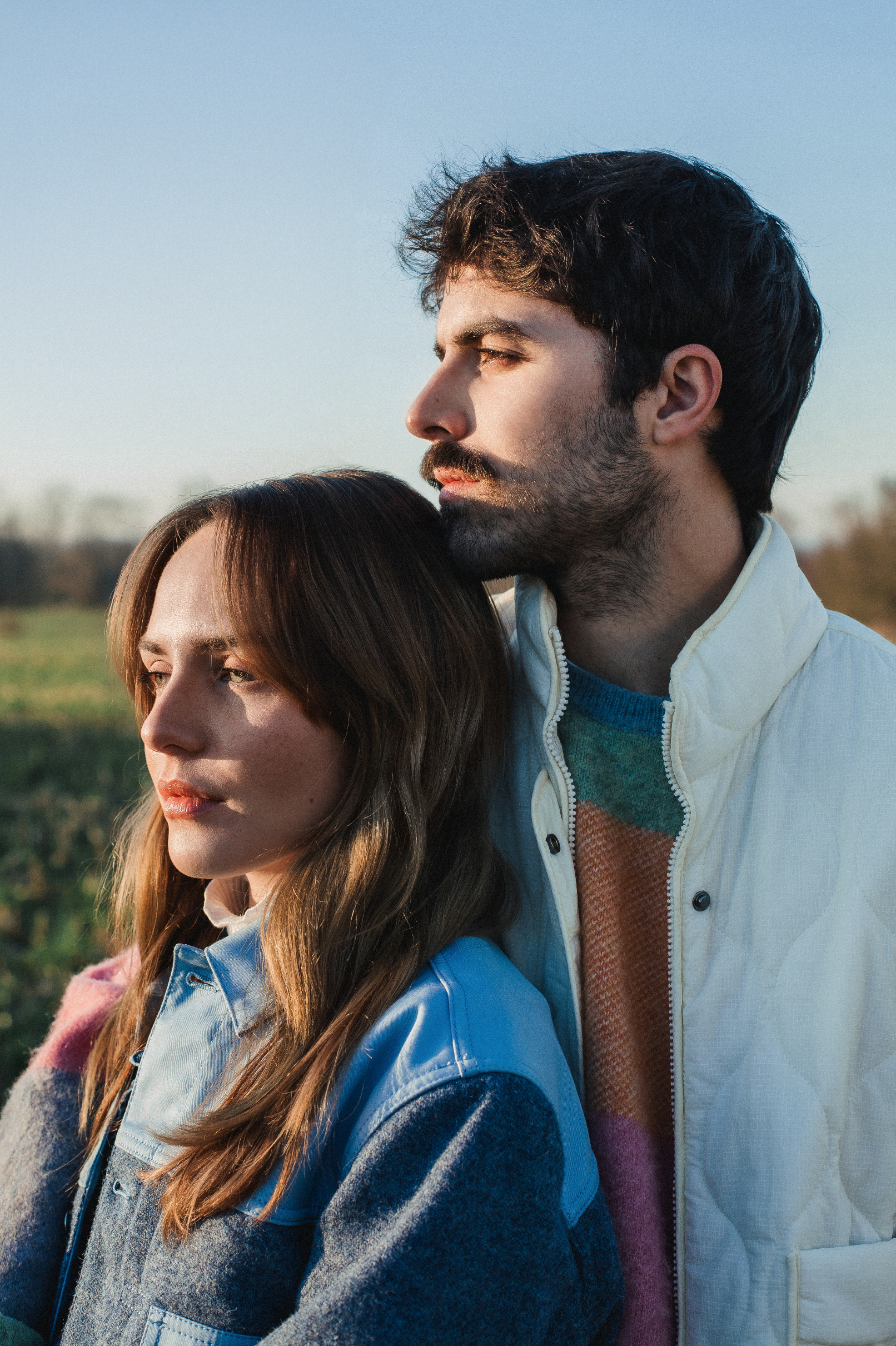 Le couple de modèles Agathe et Pierre sont l'un contre l'autre et Agathe regarde au loin, vers le soleil qui commence à se coucher dans un champ