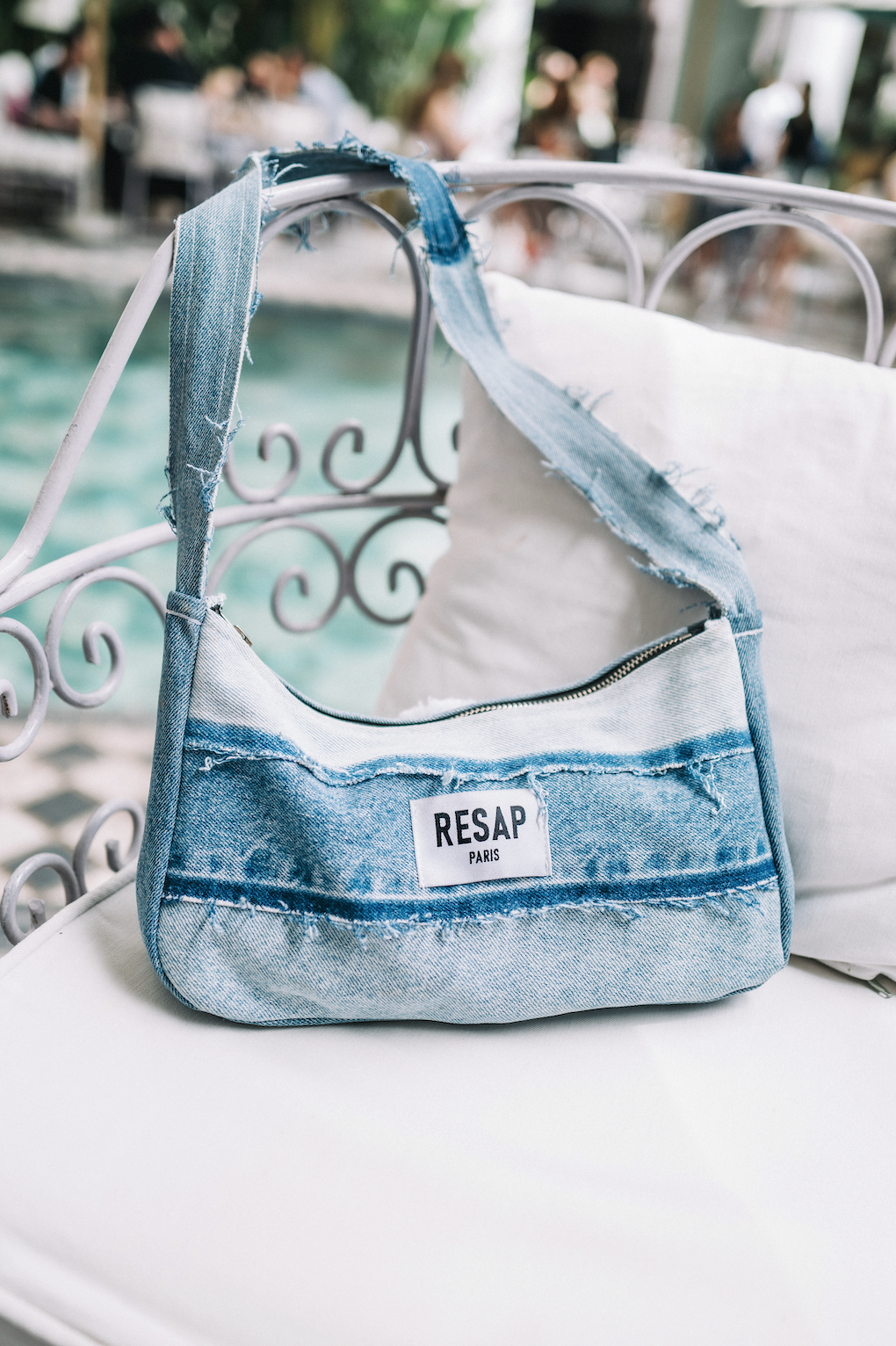 Sac en jean de la marque Resap Paris posé sur une chaise dans un café à Marrakech