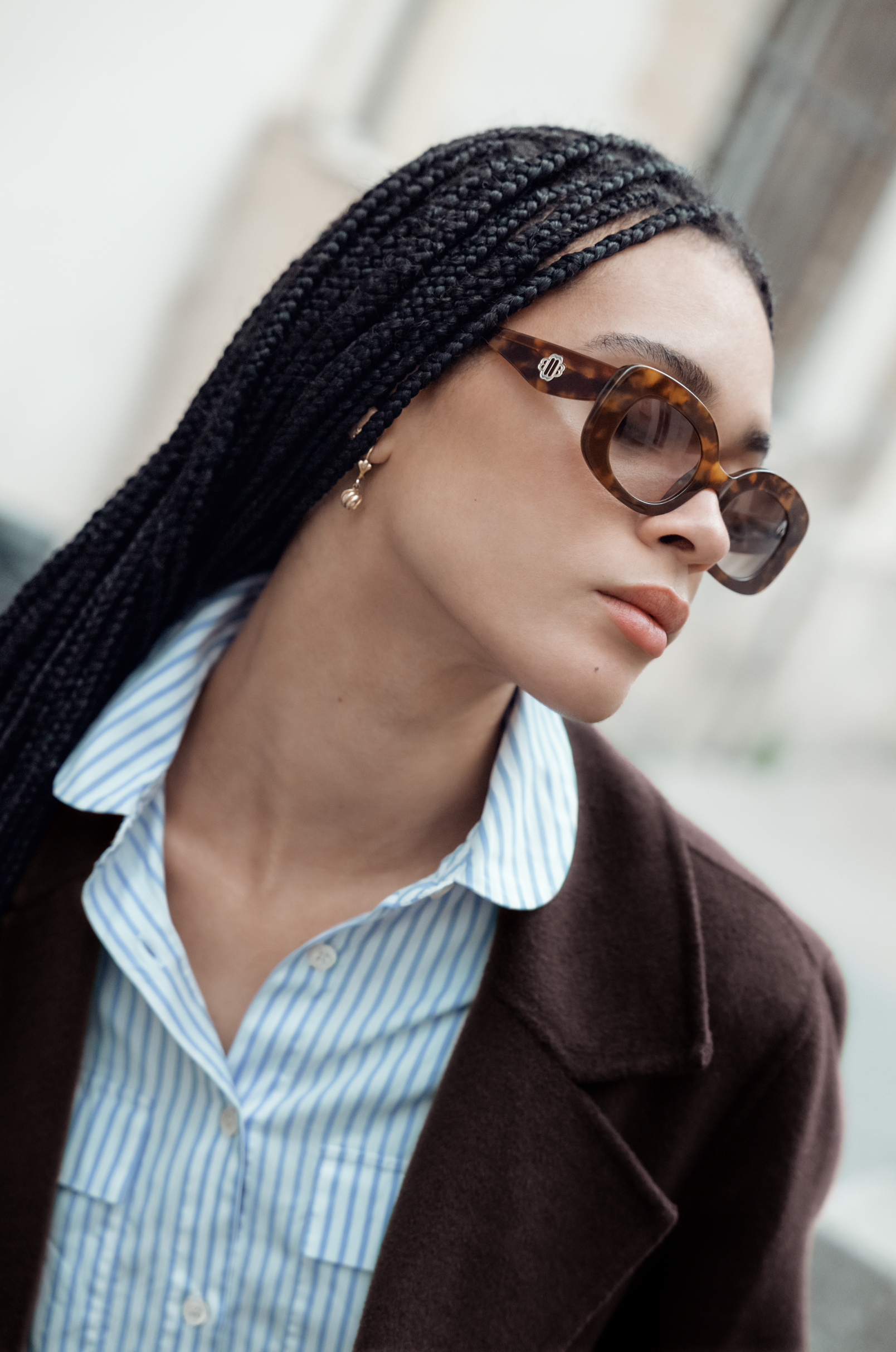 Portrait de la modèle Joy qui porte des lunettes de soleil Maje en écailles marrons