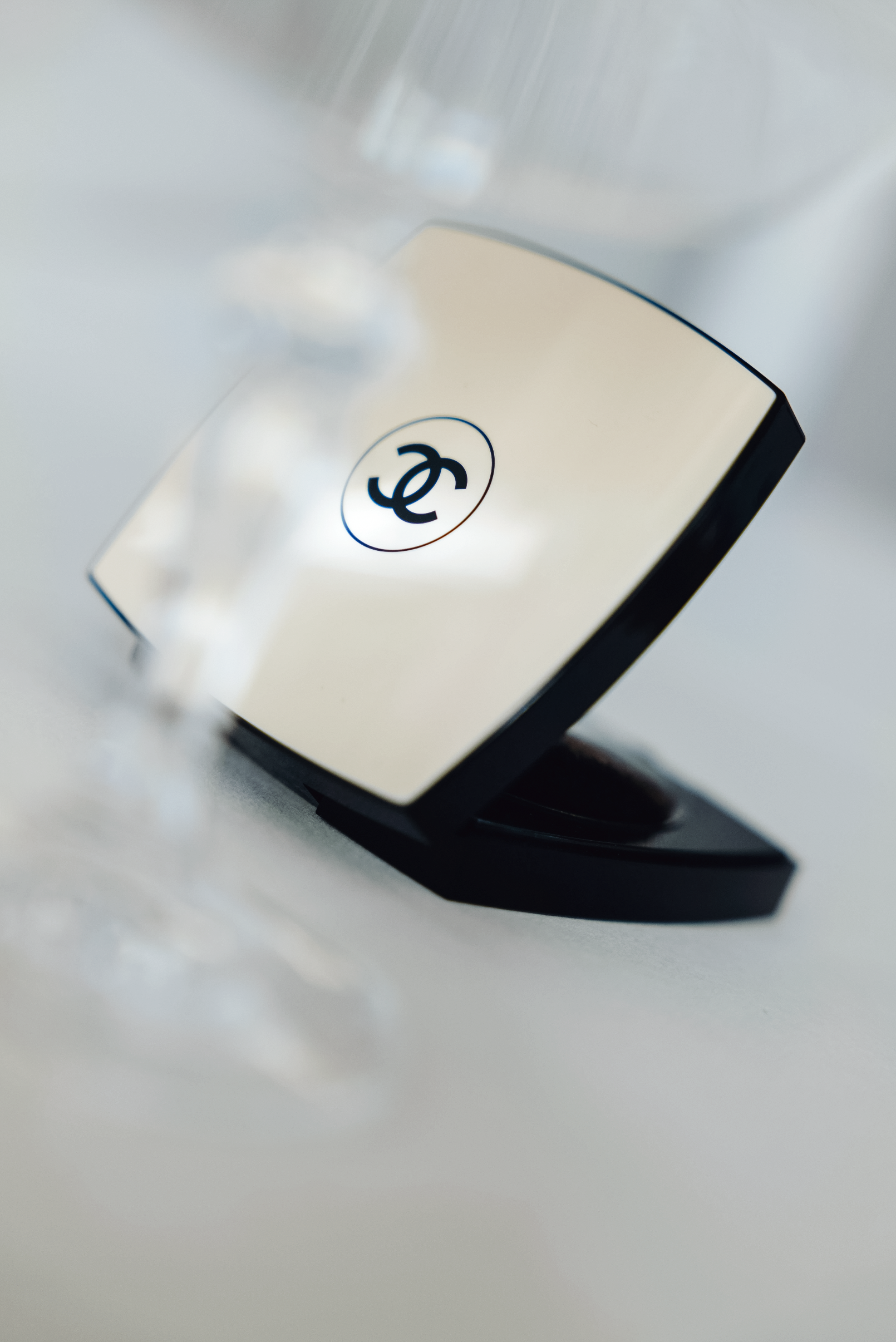 Un poudrier chanel dans lequel se reflète une lumière